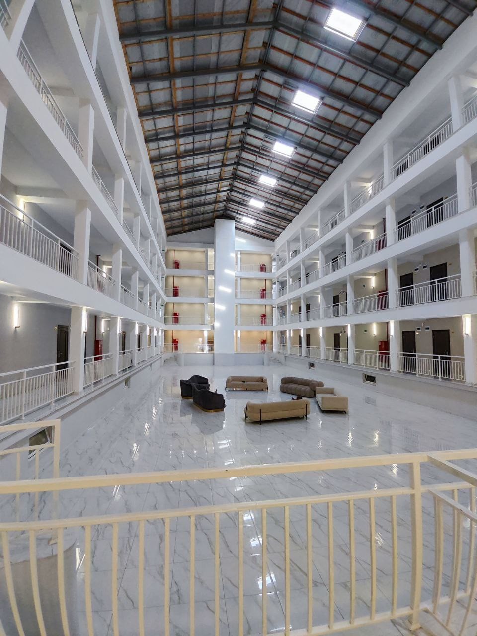 Отель совсем новый, и это чувствуется. Из четырёх лифтов работает только один, так что несмотря на малую этажность здания, ждать его приходится подолгу. Идёт лифт до четвёртого этажа. А мы, напомню, живём на пятом. И на наш этаж подняться можно только ножками.