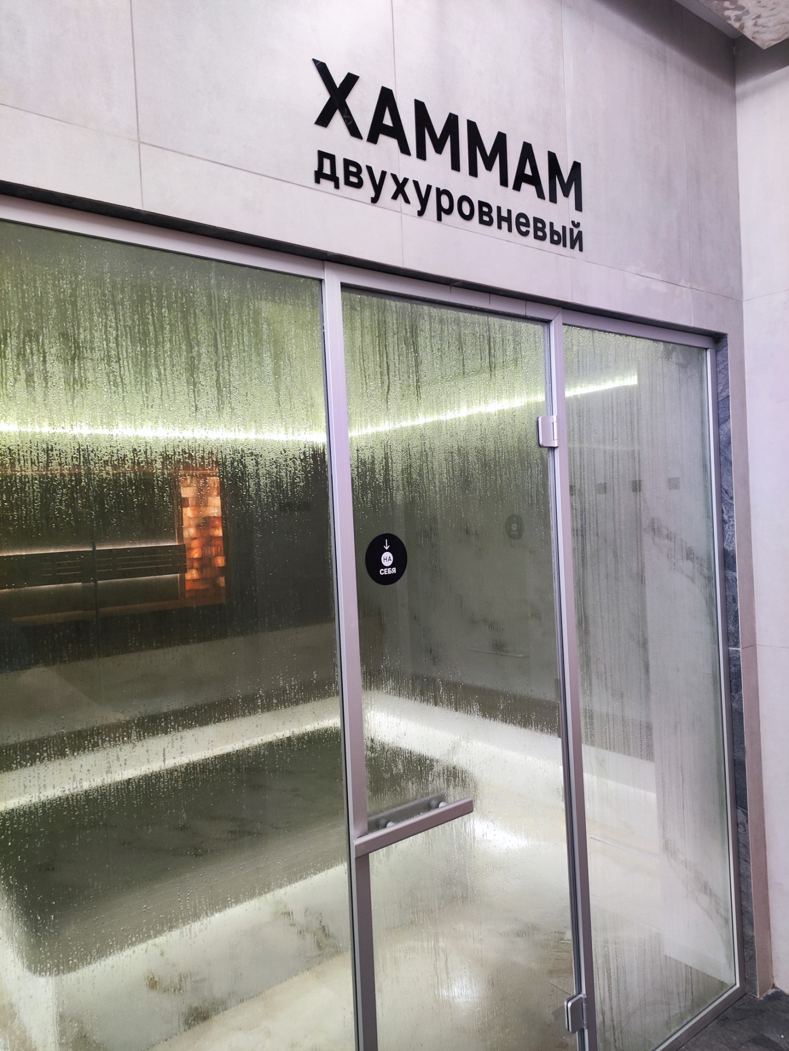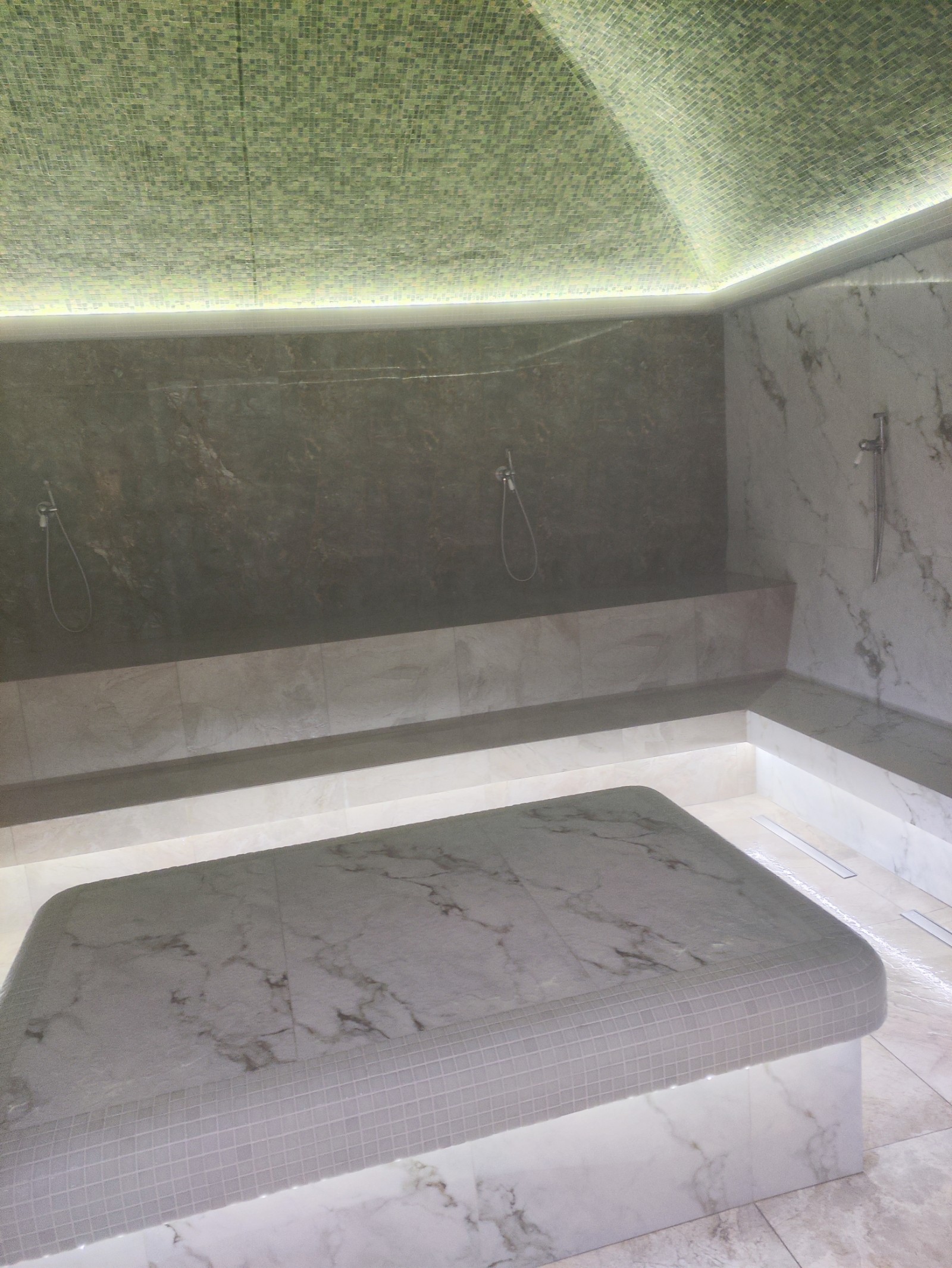 В хамаме очень понравилось. Не только потому, что просторно, но ещё и очень грамотно организован температурный режим. Там комфортно прогреваешься, но влажный, наполненный паром воздух, не обжигает совсем. Много мест, чтобы расположиться, посередине просторный подиум, на котором может улечься несколько человек. Второй хамам почти такой же, только в нём ещё и сидячие места в два этажа.