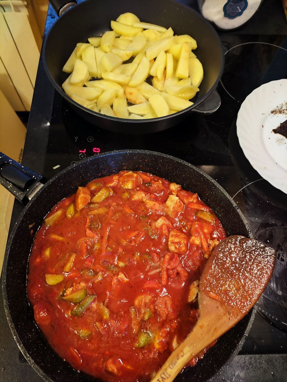 Закончив с зарядкой, двинул на кухню. Сложил продукты в холодильник, оставил только азу. И подумал, что раз уж у меня есть нарезанное кусочками для азу филе, то азу я и приготовлю. Благо, маринованные огурцы тоже нашлись. Как и пюре из протёртых томатов.