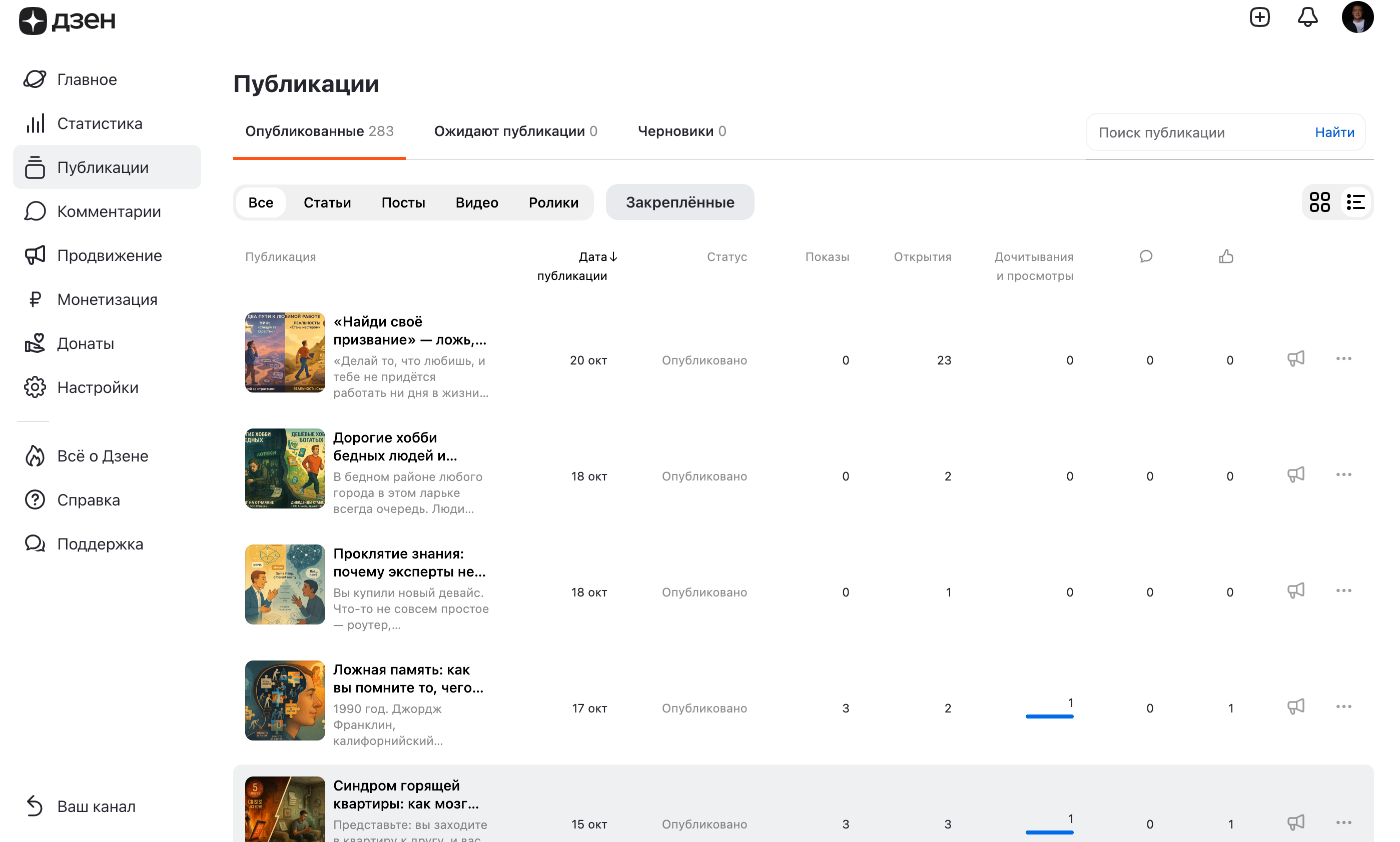 Ноль показов от дзена у последних трёх публикаций. А вот 23 открытия — это благодаря репосту в моём ВК.